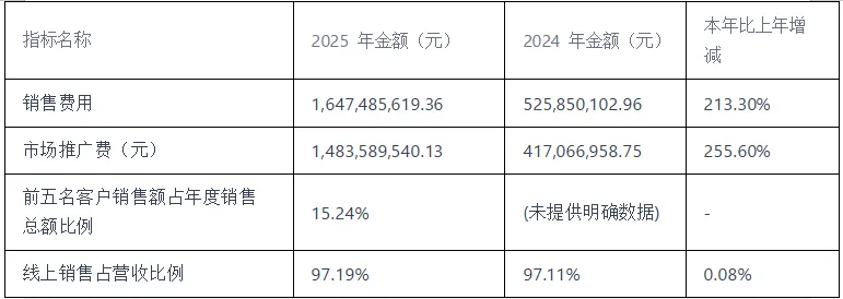 • 销售费用同比增长213.30%至16.47亿元,其中市场推广费用同比增长255.60%至14.84亿元,是导致销售费用激增的主要原因。这直接反映了公司在2025年为自有品牌和品牌管理业务的快速扩张投入了巨额的市场营销资源。