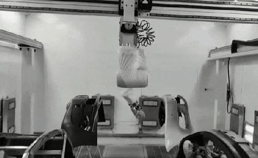 大族机器人与北京某行业客户进行深度合作,为汽车4S店喷漆车间提供免示教、全自动的机器人喷涂解决方案。机器人通过搭配3D视觉系统,对保险杠进行定位操作,并根据喷涂工艺,自主从工具区取换色漆枪、清漆枪或吹风筒。喷漆全程无需人工干预, 避免工人接触有害挥发物,且相对人工喷漆,机器人喷涂可节省色漆约10%、清漆约7%。