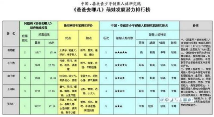 这是记者12月2日从中国·娄底青少年健康人格研究院出具的《爸爸去哪儿》亲子教育研究报告初稿中看到的研究成果。据了解,该研究院是全国第一家专门研究青少年健康人格的科研机构,潜心研究并形成了自己的智慧人格理论知识体系。《爸爸去哪儿》亲子教育研究报告是该研究院运用智慧人格理论的一个实践成果,也是全国青少年健康人格工程的第一部亲子教育著作;这部专著将长达10万余字,计划耗资50多万元,现已完成部分视频资料的文字转换和五个萌娃的家庭信息搜集整理,并根据这些资料初步形成了《萌娃发展潜力研究》与《萌娃家庭教育特点研究》初稿。