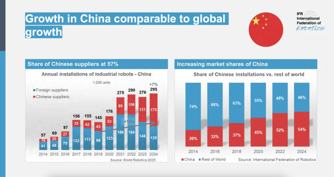 2024年中国工业机器人装机量占比来源:IFR 《WORLD ROBOTICS 2025》