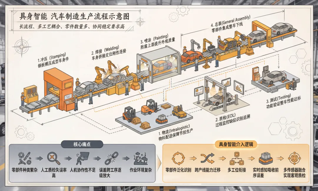 汽车制造是涵盖冲、焊、涂、总四大工艺及物流、质检的复杂耦合体系,需求在于实现海量零部件的高效集成与跨工序的高精度协同。虽然结构化工序已高度自动化,但在柔性物流、复杂装配及感官质检等“非结构化”场景中,自动化瓶颈依然突出,核心痛点与具身智能介入逻辑如下: