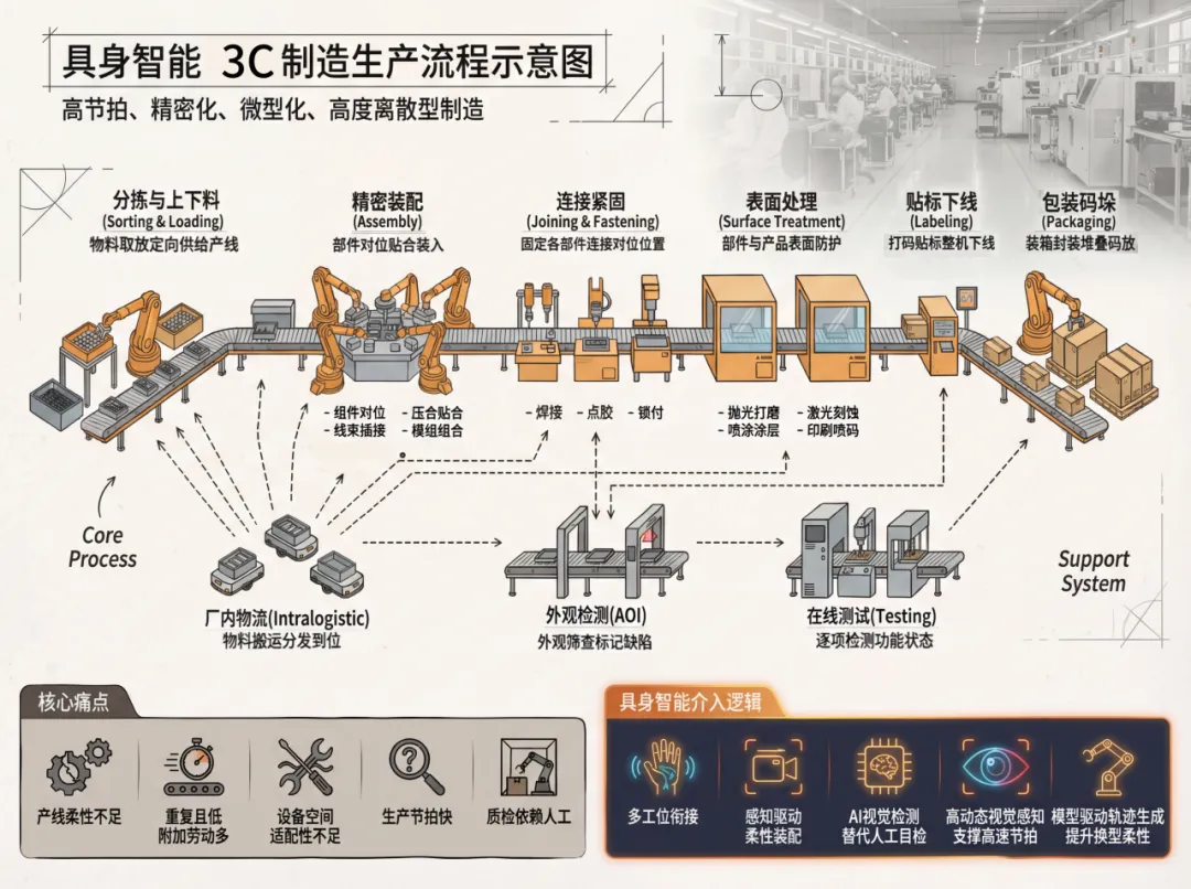 3C制造是高节拍、精密化的离散制造体系,涵盖从分拣装配到检测包装的全流程,核心需求是实现微小零部件的高精度作业与极速产出。目前,SMT及基础工序自动化程度较高,但在精密操作、异形件处理及高频柔性换型场景中,传统刚性自动化仍面临瓶颈,核心痛点与具身智能介入逻辑如下: