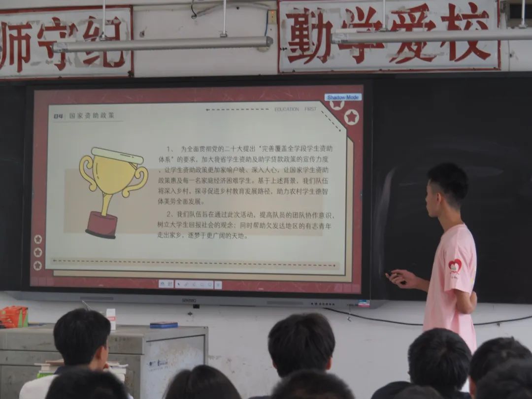 实践队伍走进惠来二中高三班级,向学生们宣讲国家资助政策。队伍发放了国家资助政策的宣传材料,并进行详细讲解,全面介绍了广东省在高等教育阶段建立的以国家奖学金、国家励志奖学金、国家助学金、国家助学贷款为主,学费补偿、助学贷款代偿、勤工助学、学费减免、社会资助和确保家庭经济困难学生顺利入学的“绿色通道”等多形式、多渠道的资助政策体系。学生们认真聆听队伍讲解并积极提问,与实践队伍形成了良好的沟通纽带。
