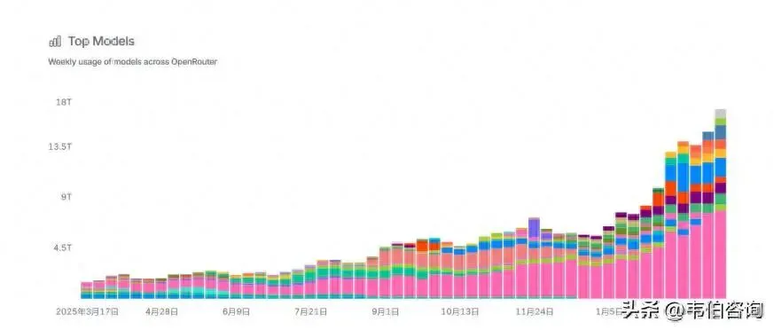 根据OpenRouter的数据,2026年2月模型token总调用量达到约50万亿,与1月相比增长约20万亿。