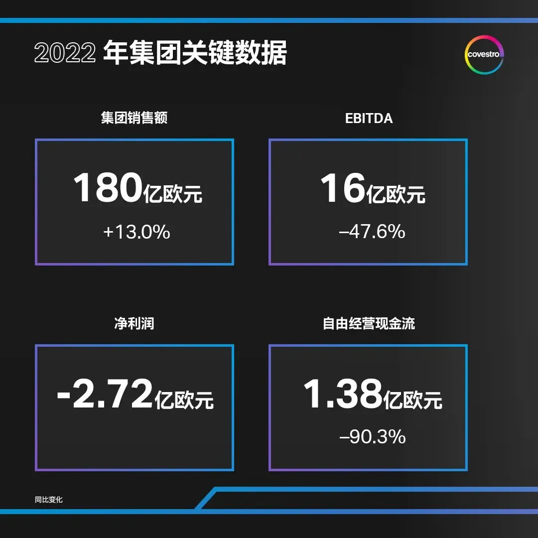 尽管在经济衰退的大环境下产品销量有所下降,集团的销售额仍在2022年实现了13.0%的增长,达到史上最高的180亿欧元(2021年:159亿欧元)。其中一个关键因素在于销售价格的大幅提高。然而,息税折旧摊销前利润 (EBITDA)受到能源和原材料价格攀升及需求疲软的拖累,较2021年的31亿欧元下降47.6%至16亿欧元。净利润下滑至–2.72亿欧元(2021年:16亿欧元)。尽管经济环境充满挑战,科思创通过强有力的营运资本管理,创造了1.38亿欧元的正自由经营现金流(FOCF)。2022全年已使用资本回报率减去加权平均资本成本(ROCE over WACC)的差值为负5个百分点(2021年:12.9个百分点)。温室气体排放量为470万吨二氧化碳当量,2021年则为520万吨。
