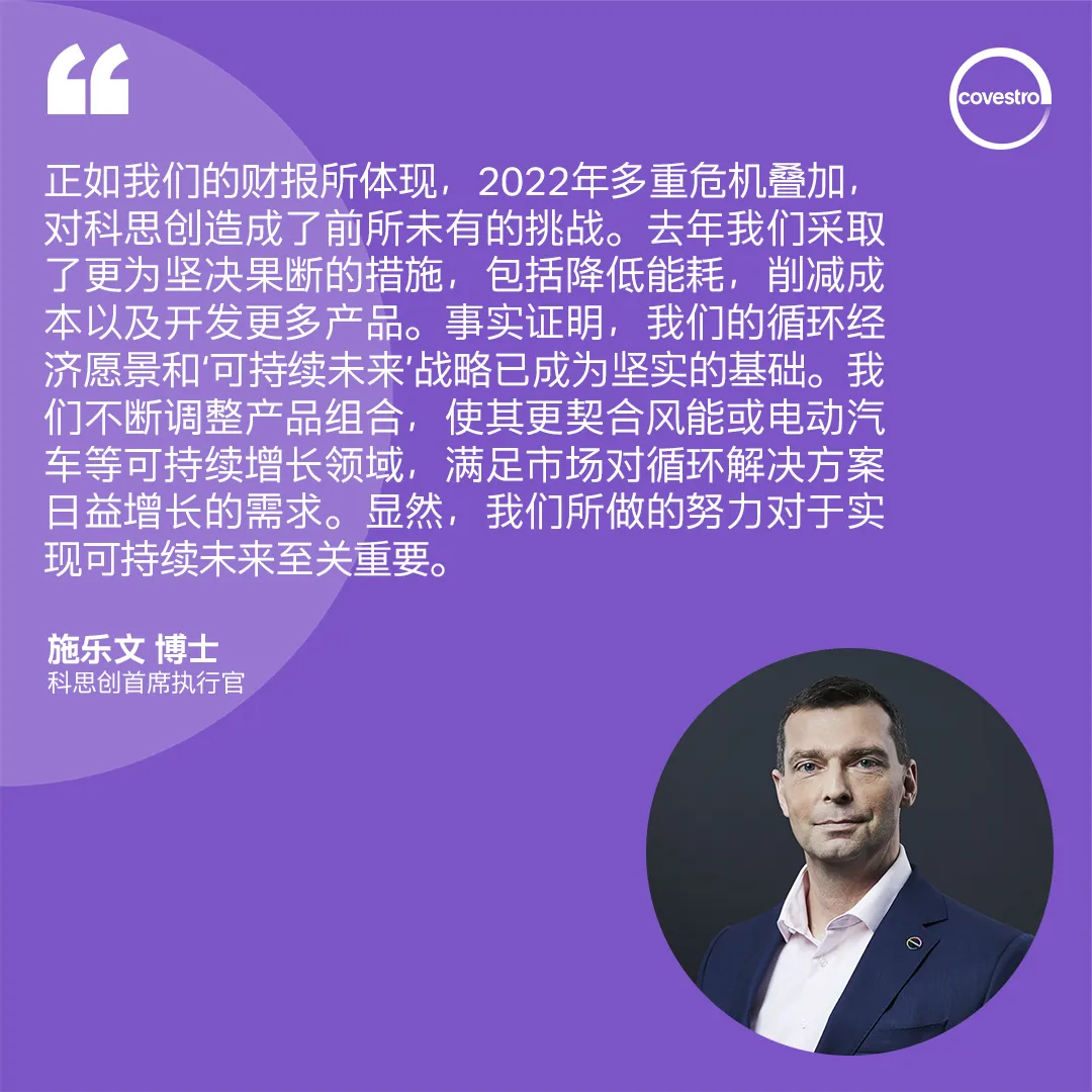 全球性挑战对科思创2022财年的业绩表现造成了重大影响。其中,能源和原材料价格的急剧上升,尤其在欧洲,为公司带来了巨大压力。中国新冠疫情、全球经济增长整体放缓以及高通胀所带来的持续不利影响更是雪上加霜。