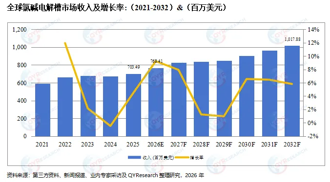 规模扩张与结构升级同步发生,2025年氯碱电解槽(Chlor-Alkali Electrolytic Cell)实现1,152套、703.49百万美元的基准盘面,2032年对应1,478套、1,017.88百万美元。以2026–2032口径测算,销量复合增速约3.6%,收入复合增速约4.8%,收入增速跑赢销量的核心来自离子膜占比抬升、产品单价上移与服务化渗透。