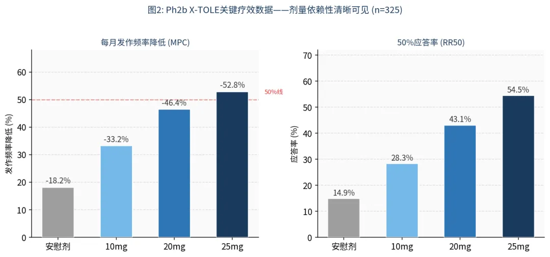 Ph2b X-TOLE是一项随机双盲试验(n=325),招募对现有药物反应不佳的局灶性癫痫患者(平均每月发作约10次),测试了三个剂量(10/20/25mg,每日一次口服)。