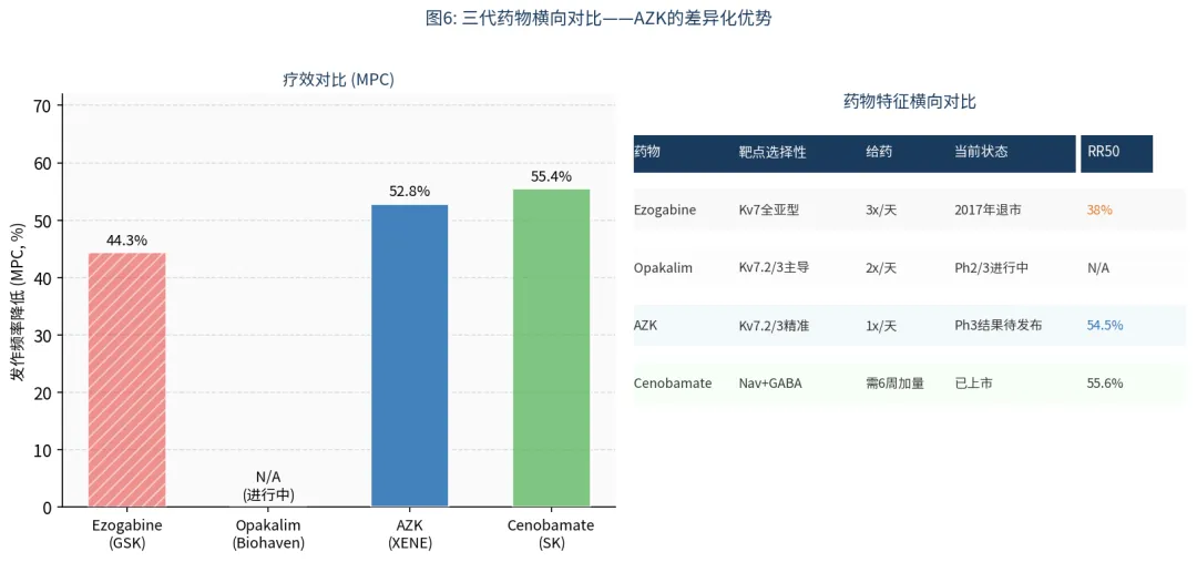 •Cenobamate(SK):不同机制(Na+/GABA),MPC/RR50指标相近,但需6周加量,已上市。AZK的差异是机制全新+使用便利。