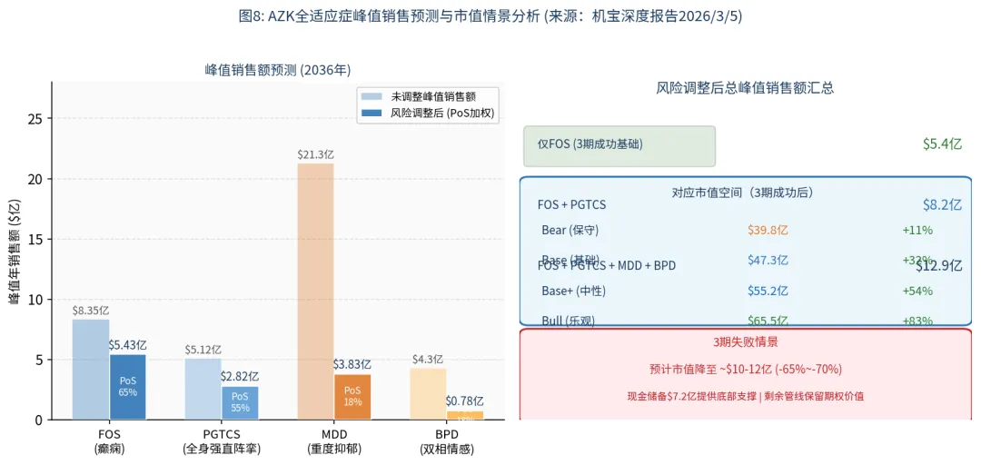 FOS单适应症未调整峰值销售额预测约$8.35亿(风险调整后$5.43亿,65% PoS)[1],若再叠加PGTCS(强直阵挛癫痫)、MDD(重度抑郁)、BPD(双相情感)等后续适应症,风险调整后总峰值销售额(2036年)可达$12.9亿。