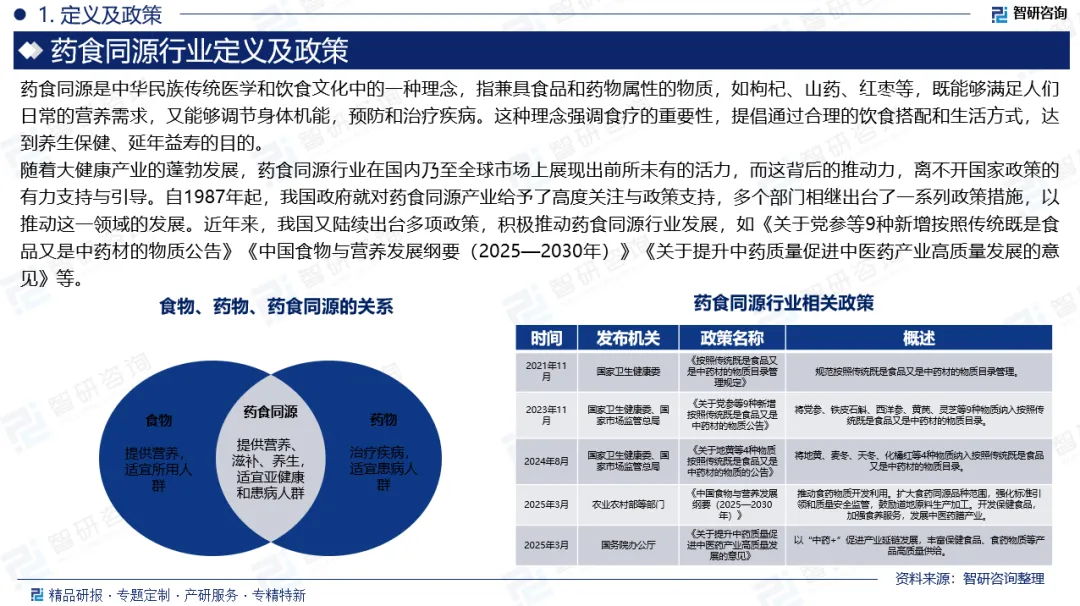 政策环境:随着大健康产业的蓬勃发展,药食同源行业在国内乃至全球市场上展现出前所未有的活力,而这背后的推动力,离不开国家政策的有力支持与引导。自1987年起,我国政府就对药食同源产业给予了高度关注与政策支持,多个部门相继出台了一系列政策措施,以推动这一领域的发展。近年来,我国又陆续出台多项政策,积极推动药食同源行业发展,如《关于党参等9种新增按照传统既是食品又是中药材的物质公告》《中国食物与营养发展纲要(2025—2030年)》《关于提升中药质量促进中医药产业高质量发展的意见》等。