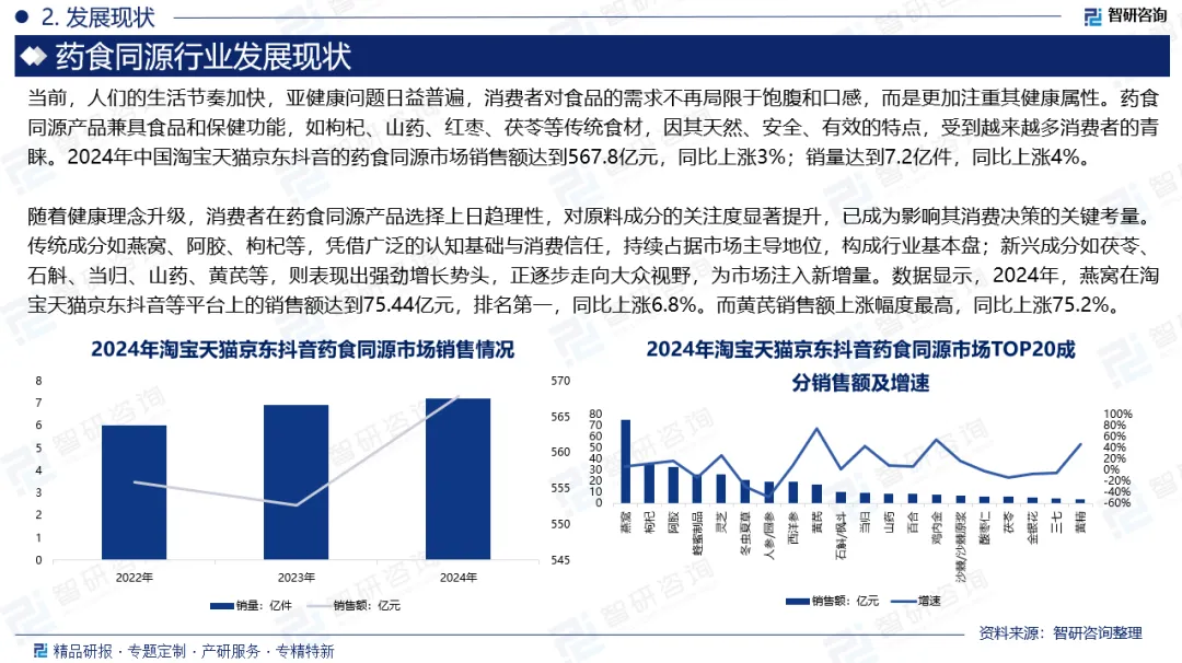 发展现状:当前,人们的生活节奏加快,亚健康问题日益普遍,消费者对食品的需求不再局限于饱腹和口感,而是更加注重其健康属性。药食同源产品兼具食品和保健功能,如枸杞、山药、红枣、茯苓等传统食材,因其天然、安全、有效的特点,受到越来越多消费者的青睐。2024年中国淘宝天猫京东抖音的药食同源市场销售额达到567.8亿元,同比上涨3%;销量达到7.2亿件,同比上涨4%。