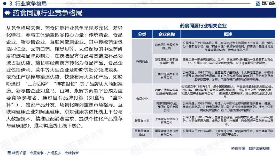 企业格局:从竞争格局来看,药食同源行业竞争呈现多元化、差异化特征,参与主体涵盖四类核心力量:传统药企、食品企业、新零售企业、互联网健康企业。其中传统药企包括同仁堂、云南白药、康恩贝等,凭借深厚的中医药研发积淀与品牌影响力,在药膳配方食品与高端滋补品领域占据优势,擅长将经典药方转化为食品产品。食品企业包括伊利、蒙牛等大型企业及盼盼等细分领域龙头,依托生产规模与渠道优势,快速布局大众化产品,如盼盼通过 “三方四季”“神农很忙”等子品牌切入商超渠道。新零售企业如盒马、山姆、永辉等商超平台成为重要竞争参与者,通过自有品牌打造(如盒马 “盒补补”)、独家产品开发、场景化陈列重塑市场格局。互联网健康企业如阿里健康、京东健康等依托线上平台与大数据技术,精准匹配消费需求,提供个性化产品推荐与健康服务,推动渠道线上线下融合。