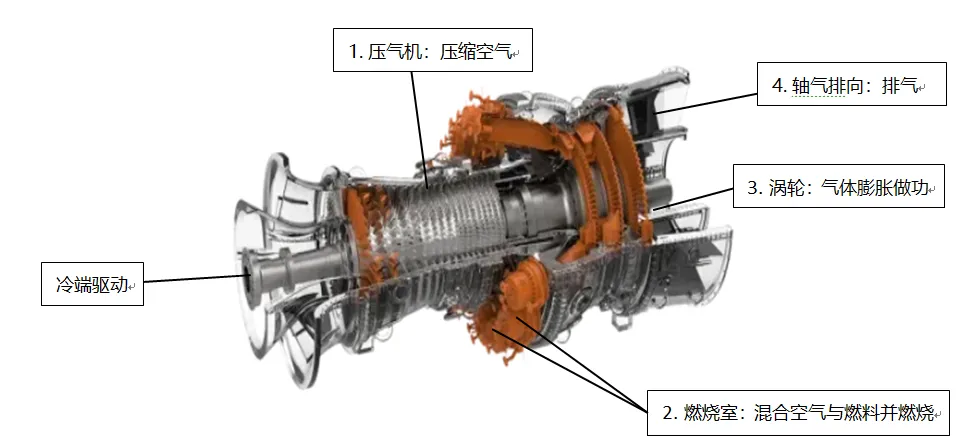 燃气轮机的工作原理基于布雷顿循环,这是一种热力学循环,涉及四个主要过程:压缩、加热、膨胀和冷却,燃气轮机典型结构和运行逻辑如下图所示(详细解释见完整报告)。