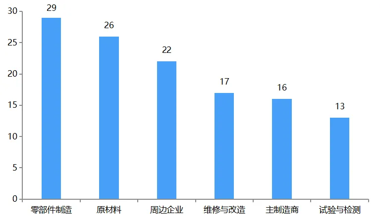 据航空产业网统计,中国燃气轮机全产业链企业总数量已超300家。航空产业网筛选出其中主要企业百余家(主营业务聚焦燃气轮机产业链的规模企业或细分领域重点企业),如下图所示,其中零部件研发与制造企业数量最多,近30家;其次为原材料研发与生产企业,企业数量为26家;产业链周边企业数量为22家,维修与改造企业17家,主制造商16家,试制与检测企业13家。