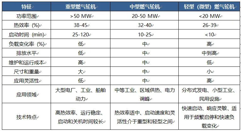 根据燃气轮机的结构及输出功率,燃气轮机可以分为微型、轻型、中型、和重型燃气轮机。下表展示了以上三种燃气轮机的主要区别: