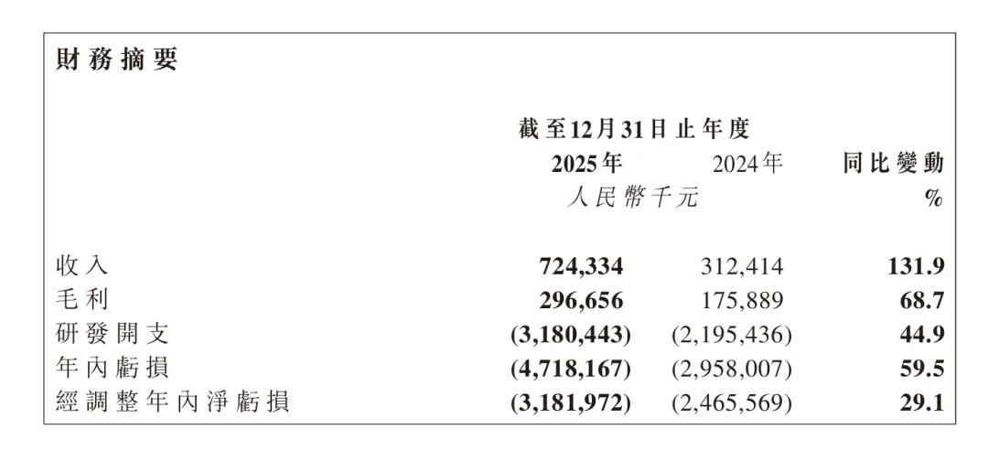 财报显示,智谱 2025 年营收 7.24 亿元,同比增长 131.9%;毛利 2.97 亿元,同比增长 68.7%;毛利率为 41.0%,较上年的 56.3% 下降 15.3 个百分点;年内亏损 47.18 亿元,同比扩大 59.5%;经调整后净亏损 31.82 亿元,同比扩大 29.1%;研发投入 31.8 亿元,同比增长 44.9%。