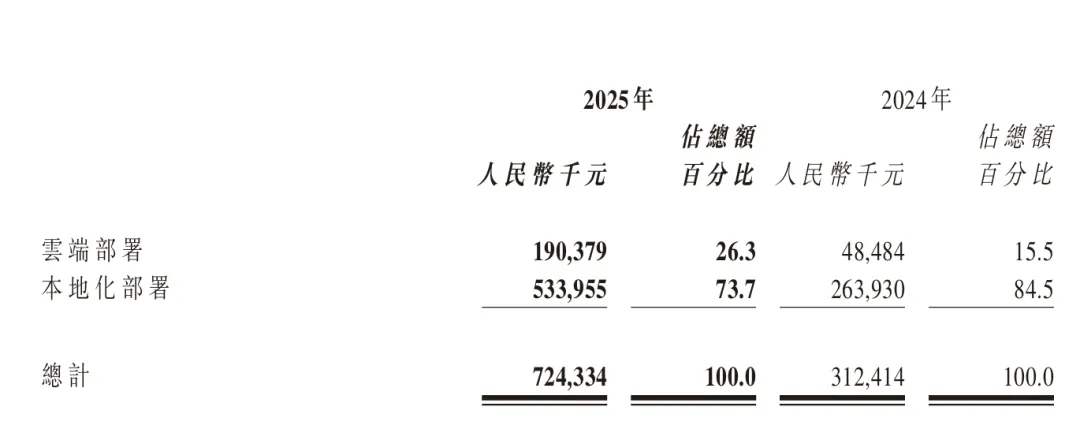 收入结构上,智谱 2025 年以本地化部署服务为主。其中,本地化部署服务收入 5.34 亿元,同比增长 102.3%,占总收入的 73.7%;云端部署服务收入 1.90 亿元,同比增长 292.6%,占比 26.3%。需要注意的是,2025 年智谱这两种服务模式的毛利率变化不一。云端部署毛利率从上年的 3.3% 提升到 18.9%,改善不小;但本地化部署毛利率则从 66.0% 下降到 48.8%。