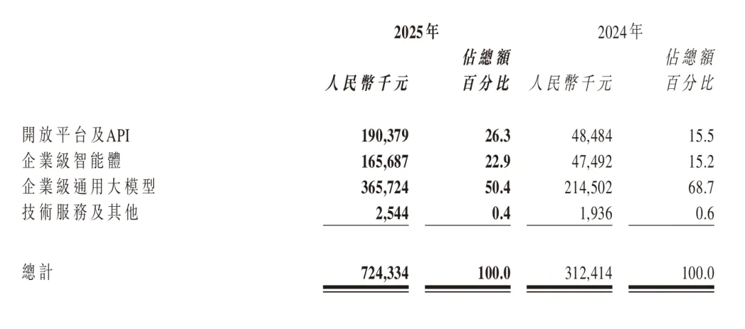 具体按业务形态与核心产品线来拆分,智谱 2025 年的企业级通用大模型收入 3.66 亿元,占比 50.4%;开放平台及 API 收入 1.90 亿元,占比 26.3%;企业级智能体收入 1.66 亿元,占比 22.9%;技术服务及其他收入占比低。