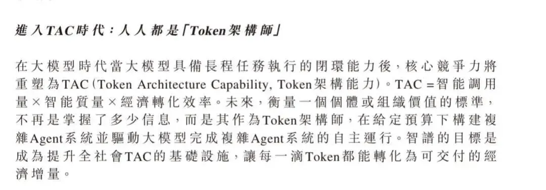 而当大模型具备长程任务执行的闭环能力后,核心竞争力将重塑为 TAC(Token Architecture Capability, Token 架构能力)。TAC = 智能调用量×智能质量×经济转化效率。未来,衡量一个个体或组织价值的标准,不再是掌握了多少信息,而是其作为 Token 架构师,在给定预算下构建复杂 Agent 系统并驱动大模型完成复杂 Agent 系统的自主运行。“智谱的目标是成为提升全社会 TAC 的基础设施,让每一滴 Token 都能转化为可交付的经济增量。”