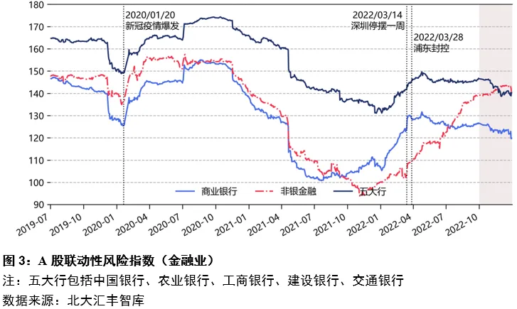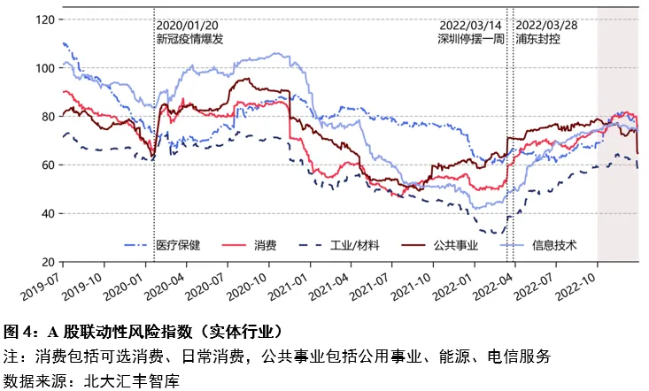 实体行业联动性风险走势与房地产行业联动性风险走势相似,均在2022年年初出现大幅上升且年末出现一定程度下降(图2)。各行业风险指数普遍于12月28日出现明显下降,这与12月出台的多项支持实体经济的积极政策有关,此外,防疫政策放松和市场对未来预期向好也一定程度上助推了各个行业联动性风险水平的下降。其中,公共事业行业联动性风险下降较为明显,而医疗保健、信息技术行业风险下降幅度有限(图4)。随着宏观经济景气度回升,2023年实体行业联动性风险有望继续下降。