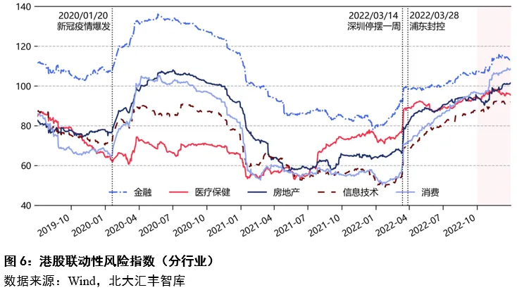 中概股系统性风险在年末出现快速下降,而港股风险则全年保持上升趋势且风险升高速度较快(图5)。港股消费行业风险的上升最为突出,这与提供消费相关服务的互联网企业的发展困境有关,相关企业的风险仍应得到重视(图6)。