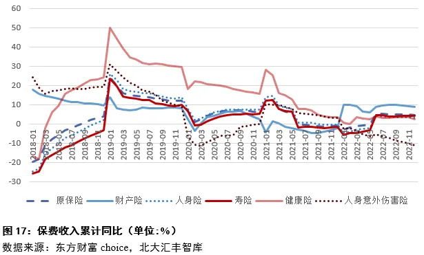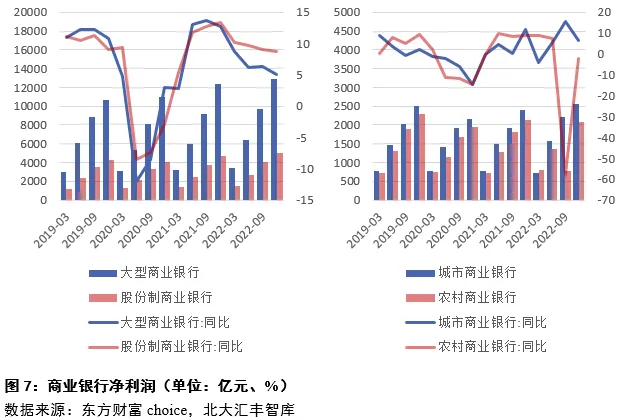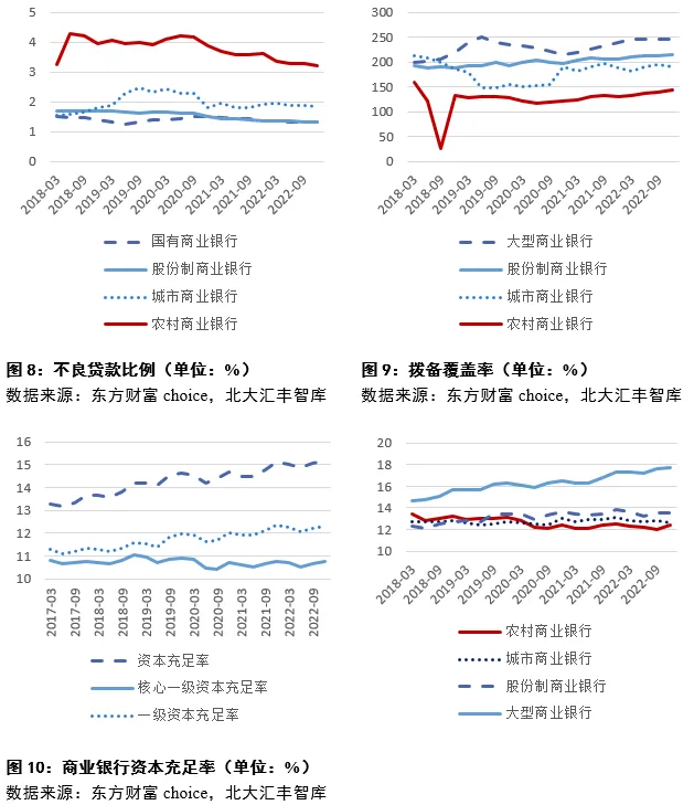 ▶ 资产质量:截至2022年末,商业银行不良率1.6%,同比下降10BP;其中,国有行、股份行、城商行和农商行不良率分别为1.3%、1.3%、1.9%、3.2%,同比分别下降6BP、5BP、5BP、41BP,均处于低位。2022年四季度商业银行拨备覆盖率为205.9%,同比升高9.0%,其中大型商业银行、股份行、城商行、农商行分别上升5.8%、7.9%、2.9%、13.8%。此外,商业银行的资本充足率为15.2%,同比上升4BP,一级资本充足率和核心一级资本充足率分别为12.3%、10.7%,同比下降4BP、5BP。整体而言,商业银行资产质量较好。