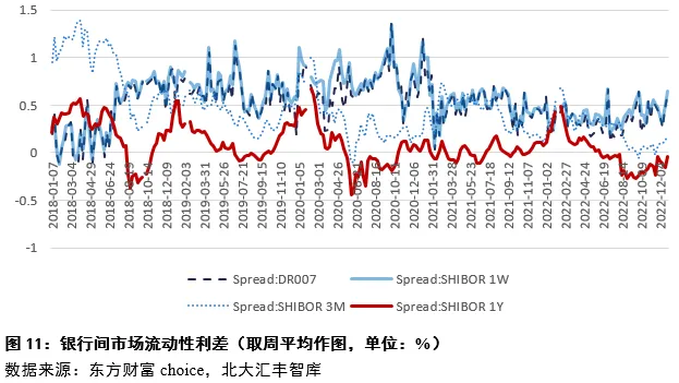 ▶ 银行间市场流动性:各期限的流动性利差[7]反映出2022年银行间市场的流动性供给较为充裕,但短期流动性利差在年底出现较大波动,这与债券市场波动和较高的杠杆资金需求或有一定关系。总体而言,宽松的货币政策对银行体系的稳定提供了较好的支撑作用。