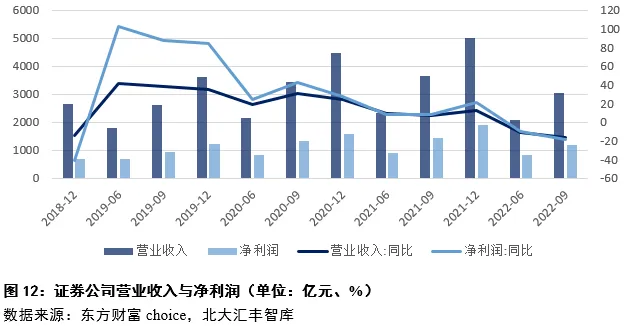▶ 证券业营收利润下降:受资本市场大幅度波动影响,2022年上市券商的业绩表现被大幅拖累,同比显著下滑。截止2022年三季度末,证券公司营业收入和净利润分别为3042.4和1167.6亿元,分别同比减少16.9%、18.9%。