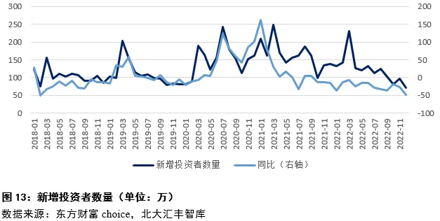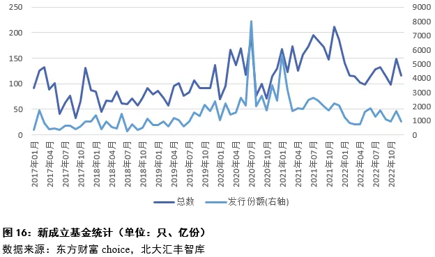 ▶ 基金规模收缩:基金业协会披露的数据显示,截至2022年四季度末,前100基金销售机构非货币基金保有规模为8.01万亿元人民币,同比下降3.82%;股票+混合基金保有规模为5.65万亿元,同比下降12.51%。2022年新发基金1424只(14642.3亿份),同比减少29.3%(50.6%)。2022 年债券市场与权益市场均出现剧烈波动,导致投资者信心受挫、赎回力度增加,这给公募基金的销售带来了较大压力,较大程度地影响了2022年公募基金业务的发展。