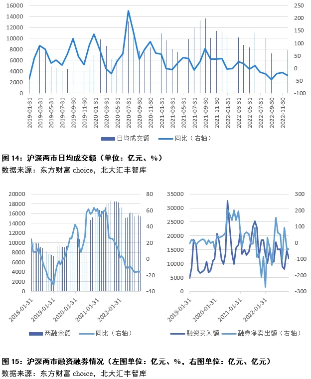 ▶ 市场活跃度下降,费率走低:2022年,沪深两市日均成交额为9251.1亿元,同比下降12.6%。A股IPO融资总额和数量分别为5223亿元和416家,分别同比减少13.4%和20%。上市公司再融资募集资金10581.10亿元,较2021年减少14.15%。截止2022年末,沪深两市两融余额为15403.9亿元,同比下降15.9%。其中,融资买入额同比下降30.1%,融券卖出额同比增加44.0%。2022 年交易情绪低迷,证券公司多项业务均受到较大冲击。此外,在Wind披露数据的99家券商中,有59家的估算佣金率同比下降,占总数的60%。2022年9月,国务院鼓励金融机构降费后券商股持续回调。11月,北交所公告下调股票交易手续费,降幅达50%。降费有助于提升资本市场服务实体的能力,但也使券商承受了较大的转型压力。