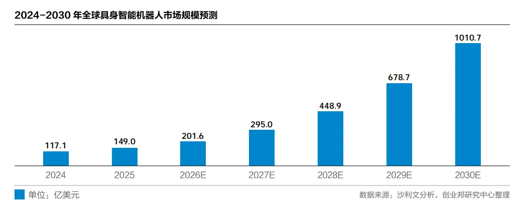 随着全球制造业亟待转型升级,制造业升级、医疗康养、物流仓储等领域对具身智能的需求旺盛。根据沙利文调研预测,全球具身智能机器人市场规模预计将从2024年的117.1亿美元大幅增长至2030年的1,010.7亿美元,年复合增长率达到43.2%。