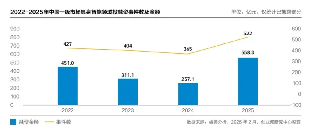 睿兽分析数据显示,中国具身智能领域的投融资呈现出“先抑后扬”的发展态势:2023-2024年经历调整期,2025年实现强势反弹,投融资事件数与金额均创四年新高,共计发生522起融资事件,已披露融资金额高达558.3亿元人民币。反映出产业对该领域的长期信心显著增强。