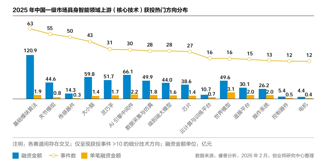 从获投的细分热门方向来看,在上游核心技术环节,基础模块算法以120.9亿元的融资额居首,显著领先其他领域;A1引擎/中间件(66.1亿元)、大小脑(59.8亿元)、数据采集与仿真(49.9亿元)、世界模型(49.6亿元)等方向紧随其后,成为资本重点投入的核心赛道,反映出市场对这些底层技术与智能集成类方向的强资金倾斜性;从融资事件数来看,基础模块算法以63起事件位列第一,投资活跃度最高;关节模组(55起)、传感器(50起)、大小脑(43起)、灵巧手(31起)及AI引擎/中间件(30起)等领域的事件数也居于前列,表明这些方向在一级市场中更易获得频繁的资本关注,赛道竞争与创新迭代节奏较快。