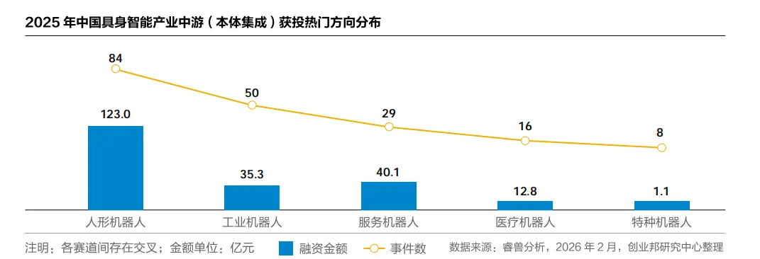 从中游本体集成环节来看,人形机器人在融资规模与频次上占据绝对主导:以123.0亿元的融资金额与84起融资事件居首位,成为中游环节最受资本青睐的领域。服务机器人以40.1亿元的融资金额位列第二,但融资数量(29起)低于工业机器人(50起、35.3亿元),反映出该领域单笔融资规模更大(或技术门槛、应用场景价值更高)。
