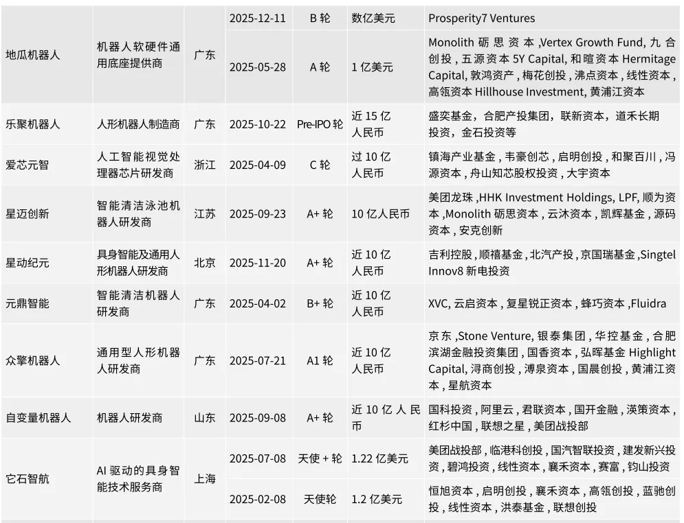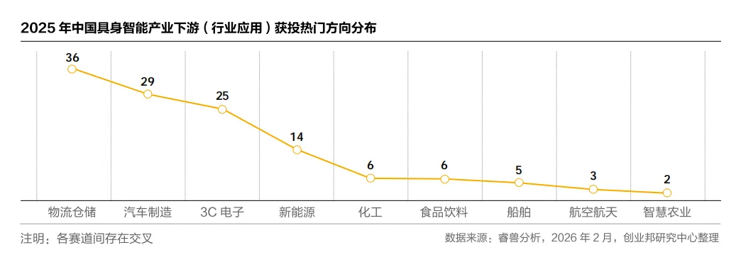 这一分布表明,下游行业应用的投资分布与产业数字化基础、自动化升级需求强相关--物流仓储、汽车制造、3C电子等领域的制造业/物流属性,使其成为具身智能技术落地的“优先试验区”;而化工、食品饮料等传统领域的投资规模相对有限,智慧农业等新兴场景仍处早期探索阶段。