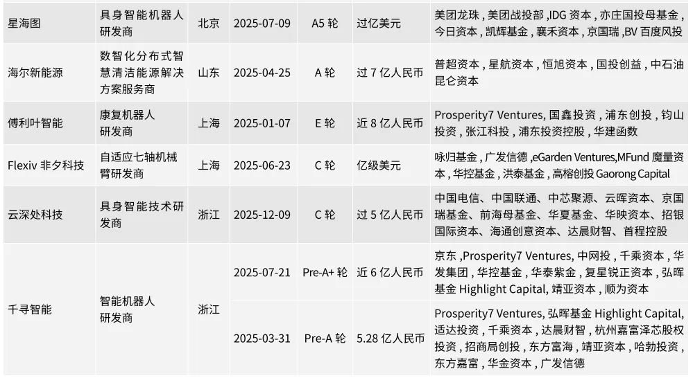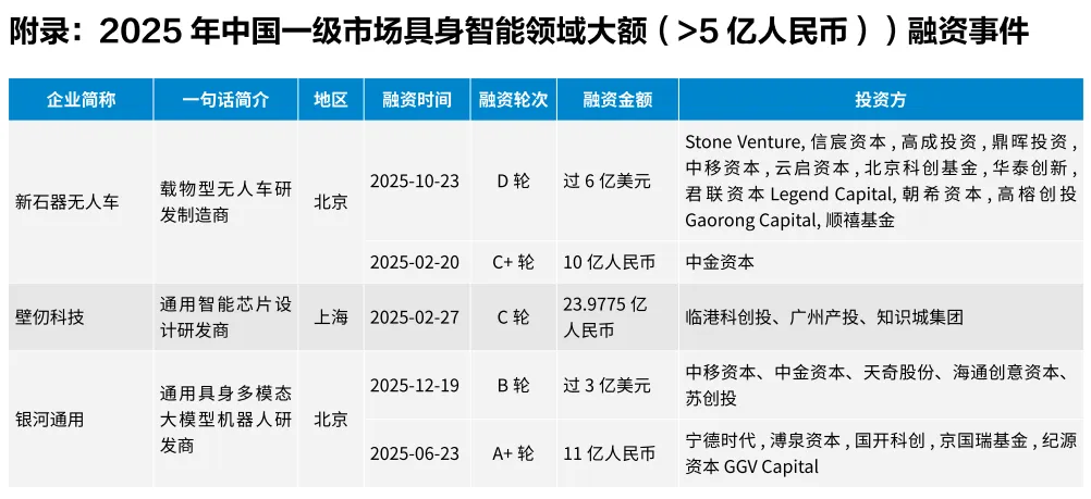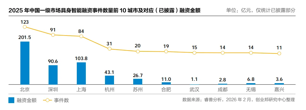 中国具身智能领域的融资活动高度向北京、上海、深圳等头部城市集中,这些城市在政策、人才、产业基础等方面的资源优势,使其成为具身智能一级市场投资的沃土。