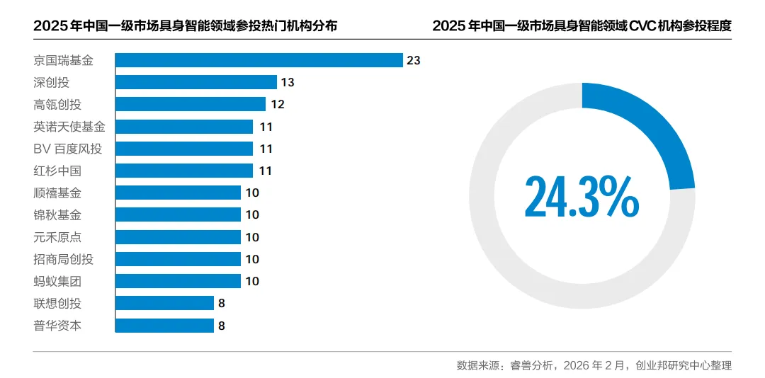 从参投资方属性来看,CVC在该领域的参投数量为127,占比达24.3%。其中,蚂蚁集团、联想创投等在其中表现突出,参与了星海图、灵宝、逐际动力、宇树科技等一线项目的投资布局。这表明CVC已强势进军具身智能领域,通过躬身入局的方式成为在一级市场布局具身智能不容小觑的重要构成。