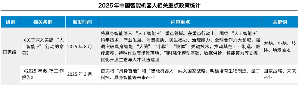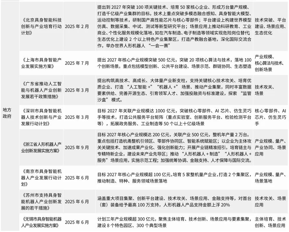 据统计,目前全国已有20多个城市明确提出发展具身智能产业。其中,以北京、上海、深圳、杭州为代表的一线城市基于自身技术研发底蕴、产业集群及供应链生态资源等优势,在具身智能机器人领域走在全国前列。其中,“技术创新”与“场景应用落地”已成为多地政策共同支持的重点方向。