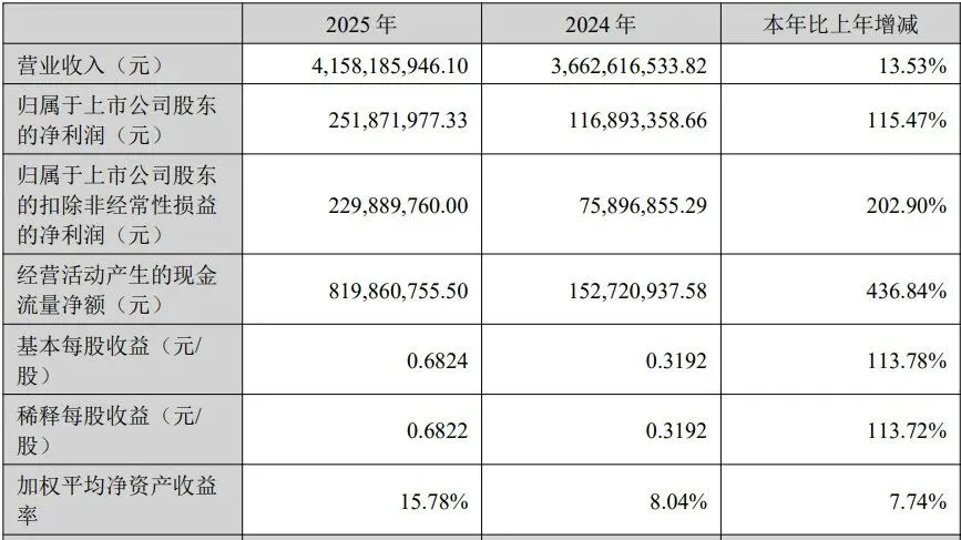 全年实现营收41.58亿元,同比增长13.53%,增速在复杂市场环境中保持稳健;更为亮眼的是其盈利能力的质变,归属上市公司股东净利润2.52亿元,同比增长115.47%,实现翻倍式跃升。