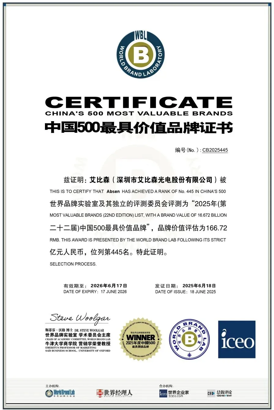 艾比森始终以技术领先作为核心战略,通过“研发投入—技术突破—市场溢价”的良性循环驱动发展,同时深耕COB、MIP等前沿封装技术,并坚定以COB技术为核心路径,持续推进面板化产品在全场景的深度覆盖。具体实践中,艾比森成功打造了全球最大户内COB小间距弧形屏,并成功落地知名科技公司上海算力指挥中心,携手博采传媒共建的全球最大单体LED虚拟影棚等多个行业标杆荣誉项目,这些成就确立了艾比森在全场景应用,尤其是高端商用与影视制作领域的技术标杆地位。2025年,艾比森公司盈利能力显著增强,毛利率约为31.13%,同比增长3.65%,这体现了其“大单品”战略的有效推进。公司不仅率先在行业发起“品牌整机,合法合规”的倡议,树立了安全与品质标杆,还以此战略为核心,聚焦户外固装、舞台租赁、商业显示、数据可视化、企业应用等核心场景,精准捕捉痛点并提供差异化解决方案,持续为客户创造不可替代的价值。▋ 品牌价值166.72亿:完成从“中国制造出海”到“全球品牌扎根”转变2025年,艾比森完成了品牌定位的战略焕新,从“至真LED显示应用与服务提供商”升级为“全球LED显示技术与应用领导品牌”。这一转变伴随着全球化策略的深化:创新推出“LED大屏品牌工厂店”模式,在韩国、越南等关键市场率先实现品牌展示、销售、服务一体化运营,强化本地化根基。同时,艾比森品牌价值获得国际认可,先后斩获联合国工发组织“国际信誉品牌”与“品牌建设标杆企业”双重认证,并荣获“2025纪念彼得·德鲁克中国管理奖”、德勤“中国卓越管理公司”殊荣,品牌价值攀升至166.72亿元,再度入选“中国500最具价值品牌”,标志着其全球品牌影响力进入新阶段。▋ 构建全球服务网络:62场培训与800名工程师筑牢信任基石全球化成功不仅依赖产品与渠道,更需强大的本土化服务能力作为保障。