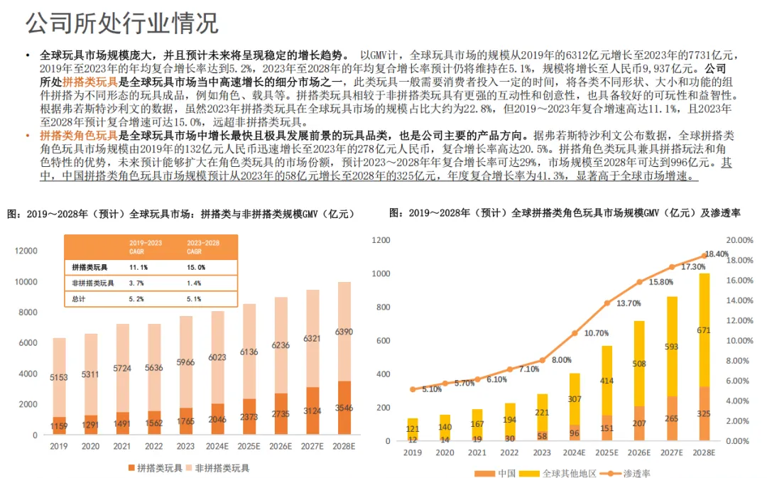 《国产模型玩具龙头企业报告》指出2023年全球拼搭角色玩具市场规模278亿元,中国市场增速41.3%远超全球,布鲁可以30.3%市占率稳居国内第一,GMV达18亿元同比增超170%,依托IP合作与高性价比产品突围。