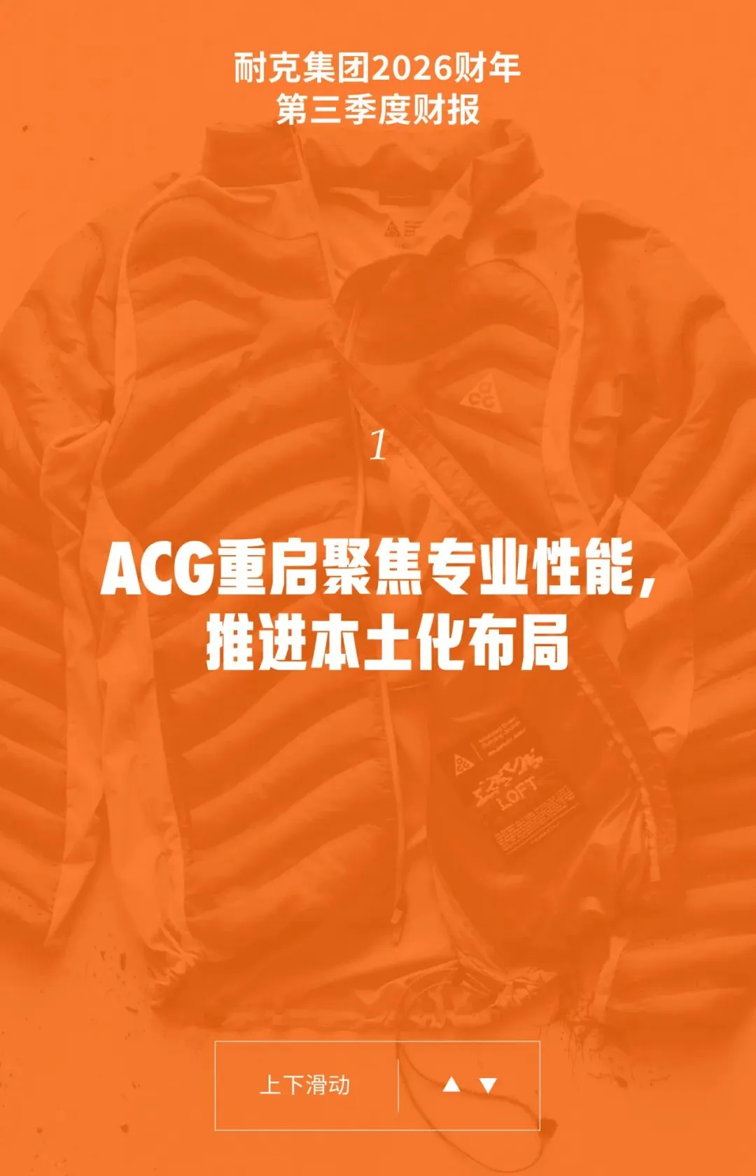以ACG品牌重塑为契机,耐克加速布局专业户外赛道。通过运动员实测驱动创新,将跑步科技延展至户外领域,构建覆盖多元户外场景的产品矩阵。ACG Lava Loft羽绒外套、ACG Ultrafly越野跑鞋等产品获得积极反馈,成为潜在市场新引擎。