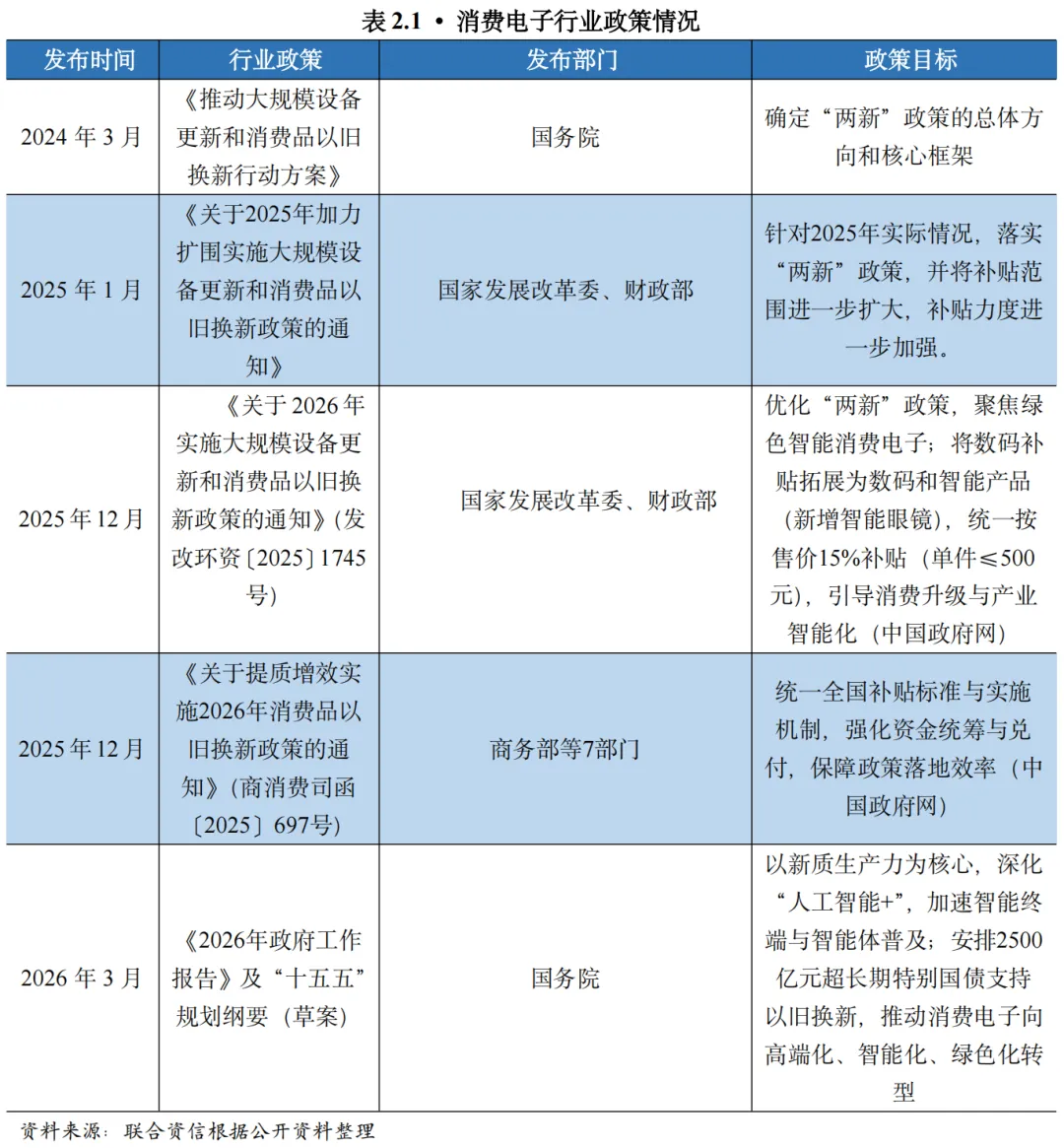 2024年以来,消费电子行业相关政策,聚焦设备更新、以旧换新及产业升级。短期来看,政策直接拉动消费电子市场需求,加速存量设备更新迭代,推动绿色智能产品普及,缓解行业库存与产能压力;长期来看,政策体系推动消费电子行业与新质生产力深度融合,促进科技创新与产业创新双向赋能,加速核心技术自主化、产业链本地化配套进程,提升行业经营韧性、履约能力与信用水平,为消费电子行业高质量发展、形成可持续竞争优势提供长期支撑。