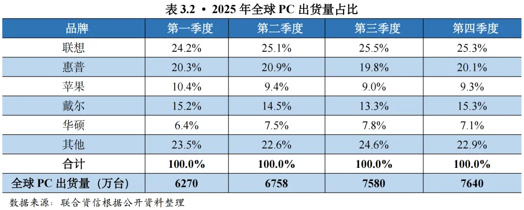 2025年,PC与平板电脑行业CR5均超过70%,竞争格局与发展逻辑分化显著。PC行业头部垄断格局稳固。根据Omdia数据,2025年全球PC总出货量达2.795亿台,同比增长9.2%。联想以25.4%的全球份额稳居第一,惠普、戴尔、苹果紧随其后,头部企业凭借供应链资源整合、持续研发投入形成核心壁垒。当前行业已进入AI驱动的爆发周期,AIPC研发涉及芯片适配、算法优化、软硬件协同等复杂领域,需巨额且持续的资金与技术投入,中小厂商无力承担,仅能退守传统低端市场。随着AIPC市场渗透率持续提升,预计未来PC行业集中度将进一步攀升,头部垄断格局将更加稳固。