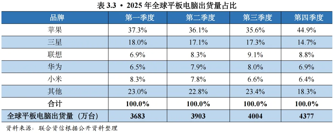 平板电脑行业竞争加剧,场景化创新打开差异化空间。苹果、三星依托先发优势与庞大用户基础占据主导地位,联想、华为等中国品牌加速崛起,市场份额稳步提升。行业竞争核心已从单纯的硬件参数比拼,转向学习、办公、游戏等场景化解决方案的优化,全球平板市场正逐步从娱乐设备向生产力工具转型,多样化场景需求为不同品牌提供了错位竞争的机会。