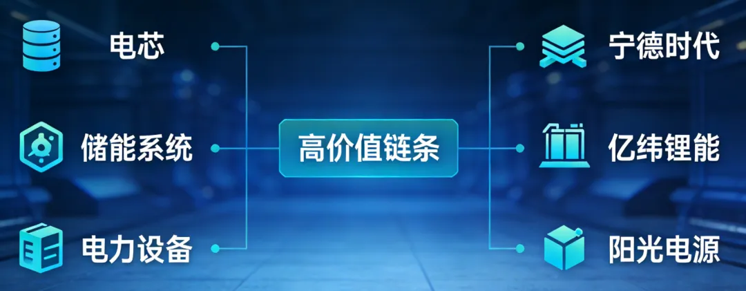 储能不是“单一产品”,而是“定制化解决方案”,不同场景(大型储能、工商业储能、AIDC储能、家庭储能)的需求差异极大,需要企业具备场景适配能力和规模化交付能力,这也是三巨头与中小企业的核心差距。阳光电源聚焦大型储能场景,其“交直流一体”10MWh全液冷储能系统PowerTitan 2.0,适配全球不同气候条件,既能满足泰州海陵独立储能电站的规模化需求,也能适配乌兹别克斯坦中亚最大储能电站的极端环境,全球化交付能力行业领先;宁德时代则重点布局AIDC储能,联手科技企业推出AIDC能源解决方案,阿联酋19GWh AIDC储能项目已启动,精准捕捉AI算力爆发带来的储能需求;亿纬锂能聚焦工商业储能与长时储能,其628Ah大电芯适配大型储能电站,同时推出轻量化产品,满足中小工商业用户的需求。中小企业大多只能提供标准化产品,无法满足不同场景的定制化需求,且缺乏全球化交付能力和售后体系,只能争夺低端市场,最终在行业洗牌中被淘汰。趋势二:产业链高价值链条清晰,“电芯+高端系统”赚走大部分利润