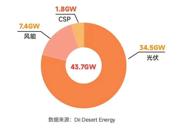 根据Dii Desert Energy《2026年MENA地区能源展望》,区域已正式进入可再生能源部署的指数增长阶段。截至2025年11月,MENA地区已投运可再生能源装机容量达43.7GW,同比增长44%。光伏发电作为核心驱动力表现尤为突出,2025年并网光伏装机容量激增至34.5GW,全年新增光伏装机达12.2GW。
