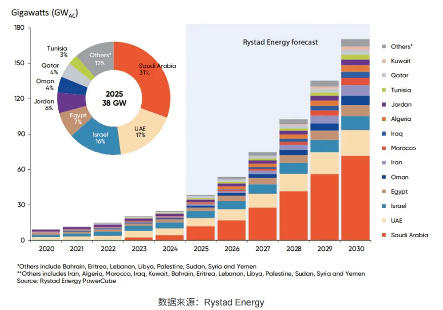 根据Rystad Energy的《Solar Outlook Report 2026》,2025年光伏新增装机约16GW,年底总装机将达38GW。沙特阿拉伯以31%份额领跑,阿联酋以16.7%紧随其后,以色列、埃及、约旦、阿曼等国构成重要支撑。
