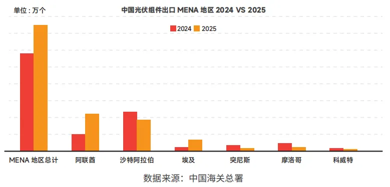 凭借自身丰富的光照资源、快速增长的市场潜力以及持续释放的政策红利,叠加中国光伏企业在欧美市场面临贸易壁垒、亟待开拓新增长极的现实需求,MENA地区已成为中国光伏出海的绝对热门地。据海关总署数据显示,2025年,中国光伏组件出口总量约5.25亿个,MENA地区总计出口5610.5万个,达 34.78GW,同比增长 46%,尤其是阿联酋、沙特阿拉伯两国市场出现了较大幅增长。据光伏咨询新闻,中东地区累计光伏装机在2025年已突破30GW,其中, 沙特从中国进口光伏组件达8.82GW,阿联酋则高达9.54GW。